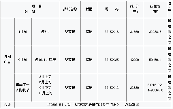 一、硬廣告重點放在周五靠近雙休日,便于市民出行采購,適合超市開展促銷活動,采用適當版面(16×8厘米)套紅發布廣告促銷信息,也可進行企業形象的宣傳及企業本身代理品牌等情況,版面大方醒目。周二發布軟廣信息稿可對周五促銷活動作前期宣傳等情況。