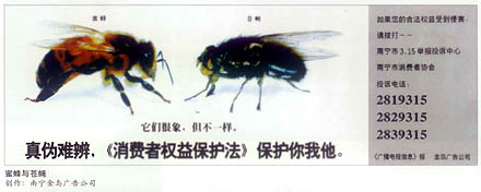 標題:蜜蜂與蒼蠅 文案:它們很像,但不一樣。 真偽難辨,《消費者權益保護法》保護你我他。