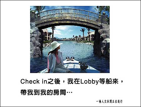 「Check in 之后,我在Lobby等船來,帶我到我的房間」深深吸引消費者的好奇之心。 放松身心、滿足好奇、追求新鮮往往是動身旅行的目的,在為花蓮理想大地渡假飯店找到「運河、人文、休閑」的定位之后,我們接下來的任務,當然就是如何促使消費者真正采取行動,吸引消費者能夠踏入飯店的Lobby成為飯店的住客。而這個吸引力當然也就必須來自飯店所能提供與眾不同的最大特色,也就是國內前所未見的「Check in 之后,搭船前往客房的服務」。
