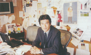 對,當了五年的業務。我進公司的第一年是在中山(幸雄)先生的底下,在創意部受了一年10個月的訓。所以我的確是他訓練出來的。不過,我實際上卻是屬于業務部。在業務部五年之后,我參加了幾個考試,當時公司有許多的考試,通過以后,可以換部門,可以出國留學,也可以進日本大學進修。因為我不會說英文,我不認為我能通過留學的考試,可是我想我至少應該能通過國內進修的考試,到日本大學進修。所以我三個考試都參加了。而我通過了換到創意部的考試。于是就加入創意部了。