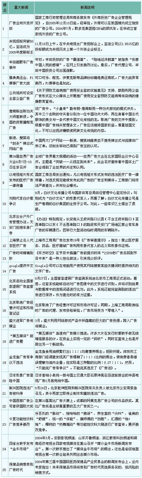 等,使得這一年格外引人注目。從2004年發生的一些重大新聞事件中,我們可以預測中國廣告行業發展的一些新動向。 1、問題廣告此起彼伏,亟需工商行政管理部門加大監管力度。
