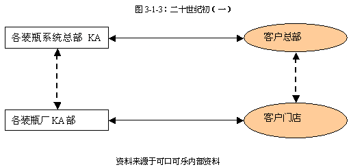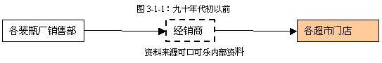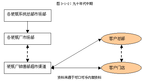 2. 九十年代中到2000年以前,也就是現(xiàn)代渠道的第二個(gè)發(fā)展階段,同時(shí),也是可口可樂公司初步完成其市場布局的階段,兩個(gè)主要裝瓶系統(tǒng)(太古和嘉里)已經(jīng)構(gòu)建完成,并且可口可樂在中國市場的主要地區(qū)均以實(shí)現(xiàn)直銷的運(yùn)作方式。