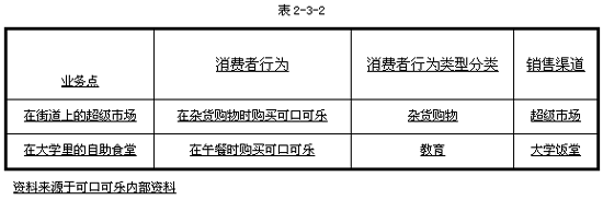 分類;最后,再依據各種行為類型劃分出不同的銷售渠道。由此可以看出,可口可樂在進行銷售渠道分類時依據的最基本的原則就是“消費者行為”(見圖2-3-1)。
