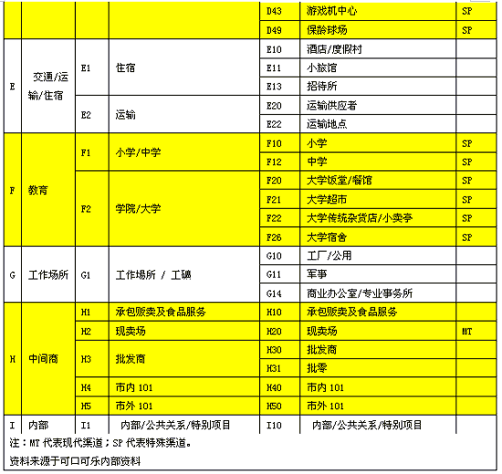 可口可樂系統是一個龐大的系統,不但包括可口可樂公司本身,還包括裝瓶廠系統,因此,為了提高系統內部的溝通效率,提高對營銷渠道的研究和管理水平,建立完善的渠道編碼,可口可樂公司對各種銷售渠道進行了統一的歸類和劃分。