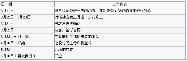 以下是我公司的工作排期表格,希望我們雙方在友好的合作中,將我們的計劃成功執行。