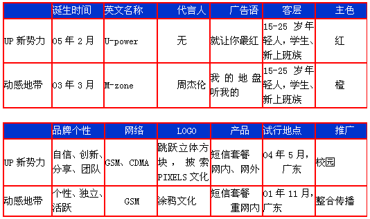 “動感地帶”誕生兩年之后,中國聯通追隨“動感地帶”的足跡比葫蘆畫瓢推出了“UP新勢力”(U-POWER)。(見表二)由于用戶(15-25歲的年輕人)重疊定位、提倡“共享”及過多的模仿痕跡,導致“UP新勢力”拋離了主流年輕人的群體特征,一時難以撼動“動感地帶”在年輕人通訊市場上的霸主地位。