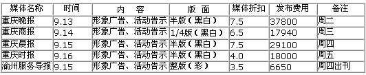 《重慶時報》四家主流媒體和《渝報》做直效的活動傳播媒體,并在其他媒體上予以新聞配合。具體發(fā)布排期如下: