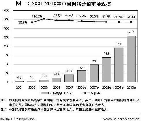 網絡廣告源起于1994年10月,當時美國的《Wired》雜志網絡版首次發布了AT&T公司等14家客戶的旗幟廣告,可以說是網絡廣告的鼻祖。在國內,自從1997 年3月 Chinabyte.com 獲得第一筆廣告收入以來,網絡廣告發展迅速。從出現伊始就引起了各方面的關注,網絡廣告已經成為廣告學研究中必不可少的一部分內容。根據艾瑞市場咨詢(iResearch)《第一屆艾瑞網民網絡習慣及消費行為調查》的結果發現,最影響網民消費行為的廣告中,網絡廣告成為繼電視廣告之后的主要影響廣告媒體之一。根據 iResearch 的調研數據顯示,2005年中國網絡廣告市場總量達到41.7億人民幣,而據有關調研機構預測,2006年這個量要達到65億人民幣,較2005年增長55.9%,預計到2010年時,中國網絡營銷市場規模將有望達到257億(見圖一)。通過網絡來找到你的客戶,已經是中國許多企業認同且信賴的方式。盡管與中國廣告市場1500億的數字相比網絡廣告的規模并不大,但是其成長性驚人。[6]