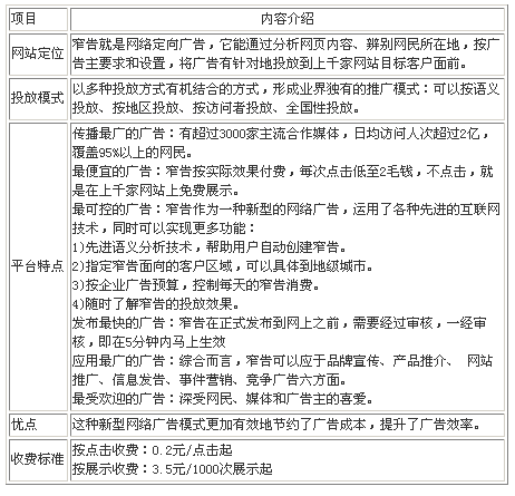 “窄告”通過網絡搜索進行語義分析,把按客戶要求定制的廣告自動投放到與其內容相匹配的網絡文章周圍,而且還能根據瀏覽者所在區域、瀏覽習慣這些個性化特點進行投放。舉例而言,與一條題為“網絡手機撥打市話每分鐘一角錢 售價3000多”的新聞相匹配的窄告內容包括IP電話、短信等信息;而在另一條關于郭德綱的新聞后面則會發現諸如演出票務的窄告內容。這種精確化的廣告投放方式不僅有效節約了營銷成本,更由于窄告強大的媒體平臺而得了強勢宣傳。“窄告”還能根據IP地址對目標區域進行區分,鎖定廣告商指定的目標客戶所在區域,只在相應的區域投放。