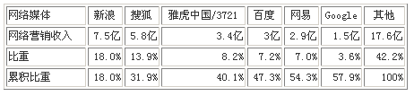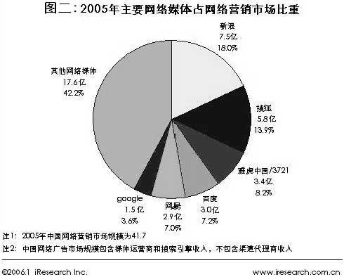 根據iResearch的調研數據顯示,2005年中國網絡營銷市場規模為41.7億元,新浪以7.5億網絡營銷收入占中國網絡營銷市場比重為18.0%,搜狐以5.8億網絡營銷收入占13.9%,雅虎中國/3721以3.4億網絡營銷收入占8.2%,百度以3億網絡營銷收入占7.2%,網易以2.9億網絡營銷收入占7.0%,Google以1.5億網絡營銷收入占3.6%。中國主要網絡媒體收入累計占整個網絡營銷市場比例近六成(如表二所示)。[18]鑒于以上數據,網絡營銷市場領域同樣存在類似的“二八定律”(即,中國 80% 的網絡媒體廣告份額被等 20% 的主流媒體所占據),新浪、搜狐、雅虎中國/3721、百度、網易、QQ等大型網站擁有絕對的影響力和市場控制力。