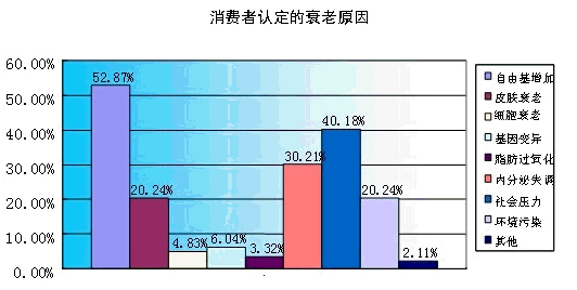 但是,“自由基”市場成熟了嗎?為了了解市場對“自由基”這一概念的接受程度,以決定產品上市策略,高度市場研究中心對154名26~50歲的女性消費者做了一份調查。我們將自由基增加、細胞老化、內分泌失調等導致衰老的因素排列,讓她們選擇導致衰老主要因素。(如圖一)