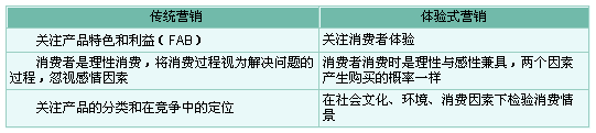 費中、消費后的體驗,才是研究消費者行為和企業(yè)產品營銷的關鍵,運用企業(yè)營銷的活動為消費者的購買前、購買后所提供的刺激促成消費者購買行為產生、消費后滿足和后續(xù)購買行為的持續(xù),其實現(xiàn)的基礎在于消費者響應這種刺激并對企業(yè)營銷活動的直接觀察和參與促成。傳統(tǒng)營銷與體驗式營銷的區(qū)別: