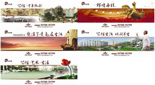 選擇一種全新戶外媒體——出租車體廣告。面對這一全新的媒體,公館·世家做了“吃螃蟹”的第一人,選擇了200~300輛的出租車體投放,形成第一視覺風暴,使“公館·世家”成為全鄭州的焦點和亮點。兩道“情景走廊”:在小區大門口南陽路段的外街面,噴繪展示二期新形象。