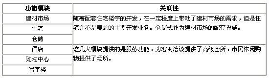 泰龍現代商城包括多種物業形態:建材交易市場、四星級酒店、商業(包括購物中心和寫字樓)、配套住宅、配套倉儲等,但是泰龍現代商城的投資重點是在長期運營的建材交易市場、酒店和商業物業。住宅和倉儲是作為建材交易市場的配套內容。下表將分析泰龍現代商城功能模塊的產業關聯度,從而考察幾個模塊是否能夠實現優勢互補。
