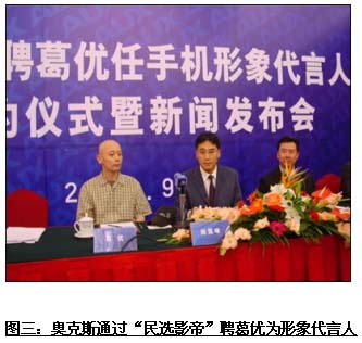 而在召開此次聘請形象代言人的發布會之前,奧克斯通訊啟動了一場形象代言人“選秀”活動,考慮到借勢中國電影百年的盛事,最終把“選秀”的目光鎖定在曾經獲得國內金雞、百花的“影帝”們。根據部署,奧克斯手機先是把姜文、葛優、陳道明、張豐毅、李雪健、陳寶國、李保田、劉佩琦八位影帝列進“候選名單”,然后由員工、供應商、經銷商以及公眾通過各種途徑投票。最后得票最高的那位,將由公司最終通過談判確定成為奧克斯手機的形象代言人。這樣的活動本身就有一定新聞性和趣味性,國內娛樂媒體幾乎都進行了報道,這對“無牌”而無法進行宣傳的奧克斯,又巧妙地增加了在“金九銀十”期間的傳播力度。同時奧克斯對外反復強調,奧克斯是國內第一個沒有“牌照”而聘請形象代言人的企業,讓公眾更加對“牌照”存在的合理性提出了很大的質疑。