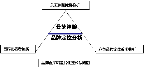 在景芝神釀品牌規劃過程中,我們決定啟用“品牌金字塔差異化定位”策略,從目標消費者檢析、競爭品牌定位訴求檢析、景芝神釀優勢檢析三大方面入手尋找“景芝神釀”精確的品牌定位,如下圖: