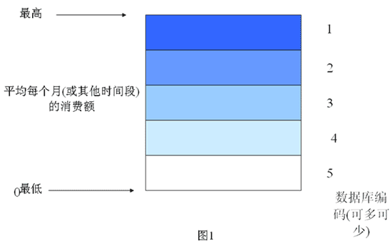 我們先用我們的經驗來理解一下基于消費行為的細分方法基本思路。 如果老板要你列出頭大客戶清單,那些客戶最有可能在未來的一年里在你們公司購買最多產品,這樣我們可以把有限的銷售人員集中在這些客戶身上。 一個最簡單(雖然可能不準確,但總比沒有好)就是把過去一年所有客戶的購買總額排個序,取出銷售總和占整個年銷售額20%的排在前面的客戶。這些客戶就是你的大客戶。這就是最簡單的RFM客戶細分的方法:按照銷售額的細分(MONEY),你也可以把銷售按照10等分,3等分等,時間跨度可以一年,一個季度,三年都可以,銷售額可以用其他的指標,如網站的發帖量,積分數量等。圖1是按照銷售額客戶分組的處理。