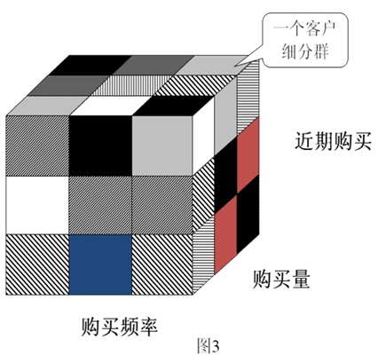 再進一步,把三個維度綜合在一起,我們就給客戶分成了5x5x5=125個立體的單元(加入都是5等分),每個單元進行編號,如532,就是R的第5組,F的第3組,M的第2組。見圖3