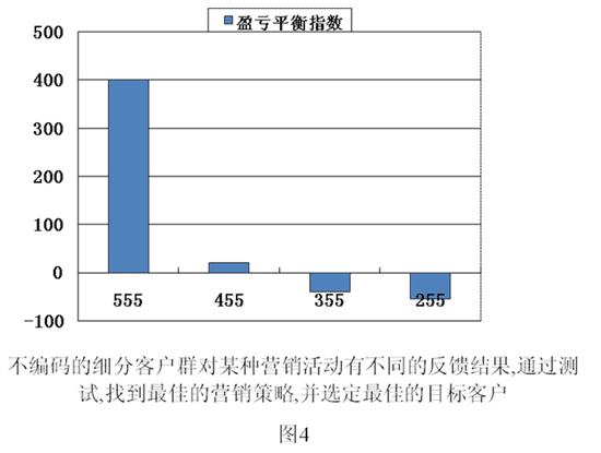 在開展一個營銷活動前對所有的單元進行測試,并計算某個單元組的營銷投資回報, 如盈虧投資回報指數,指數越高效果越好,負數就是虧損的活動,示意圖4所示。從分析圖可以看出,我們只針對555單元的客戶群開展活動,其營銷回報一定是非?陀^的。