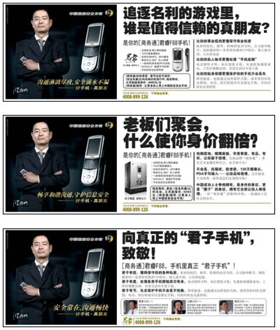 通過(guò)別具一格的1/4版面品牌硬廣與CEO系列軟文,標(biāo)題例如,《君睿F88,手機(jī)中的“CEO”》、《CEO們的“手機(jī)會(huì)晤”》、《中國(guó)CEO都用什么手機(jī)?》傳遞了深層產(chǎn)品信息,將品牌與圈文化巧妙融合,商務(wù)通信息安全手機(jī)的高端品牌形象更深入人心。