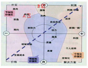 全景圖以活力、服務、個人效率等消費者追求價值元素為基礎,建立起了具有兩個維度的矩陣:縱軸表示某價值元素屬于理性元素還是感性元素;橫軸表示該價值元素對消費起促進作用還是抑制作用。