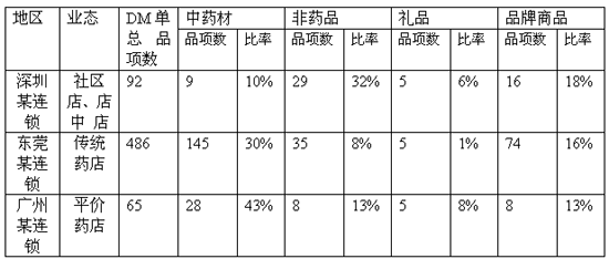 眼下年關將近,零售藥店正在緊鑼密鼓地進行各式促銷,以最大限度地從市場攫取相應收益。這基本上是出于“銷售促進”的范疇,但醫藥零售行業有著不同的商業型態,在經營模式、產品結構、商業定位上均各不相同,但在促銷載體和具體方式上卻也如出一轍,除了門店標示、店內海報之外,DM單則成為零售藥店促銷活動的最主要的載體。而從這些DM單上,則可透視出各零售藥店的產品結構和策略選擇。筆者從廣州、深圳、東莞地區各抽取一家連鎖藥店在一月份所做促銷DM單進行以管窺豹式的統計分析。