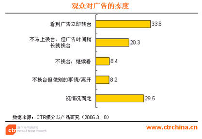 在CTR公司另一項(xiàng)關(guān)于“受眾面對(duì)廣告的選擇”的調(diào)查研究結(jié)果中顯示,33.6%的受訪(fǎng)者表示看到廣告會(huì)立即轉(zhuǎn)臺(tái),只有8.4%的人在播出電視廣告時(shí)會(huì)繼續(xù)收看。可見(jiàn)受眾對(duì)傳統(tǒng)電視廣告的逃避已是不爭(zhēng)的事實(shí)了。