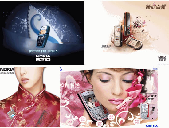比如說這款諾基亞5210平面廣告,背景感覺為一把鋒利的鋸齒在割鋼板,充分體現出諾基亞5210的硬式材質和耐磨的外殼。而這款傾慕系列手機,則完全采用產品來演繹廣告的意境通過不同角度的產品造型來展示產品的精致,以花紋的陪襯來體現產品讓人傾心奪慕,整個廣告讓人在產品中感覺廣告訴求的意境,讓人在產品中一見傾心。