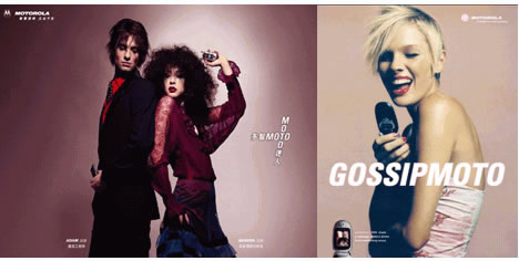 反觀以人物為導向的摩托羅拉產品廣告,人物成為了廣告的主角,產品成為了廣告的配角。通過人物的演藝來表達摩托羅拉產品的特點,通過對摩托的運用來突現摩托羅拉個性化及時尚的調性。所以摩托羅拉的很多廣告,在設計都比較突現人物的特點和個性,以次來說明產品的特點和功能。