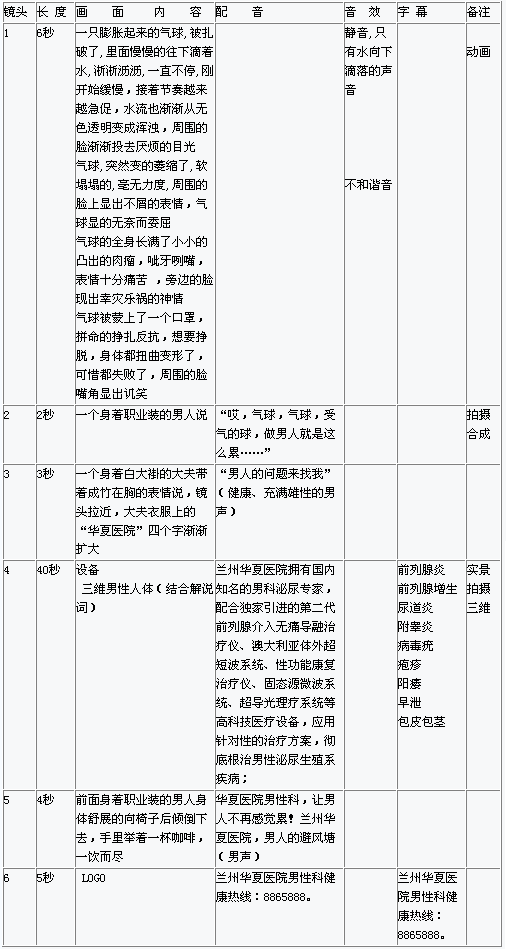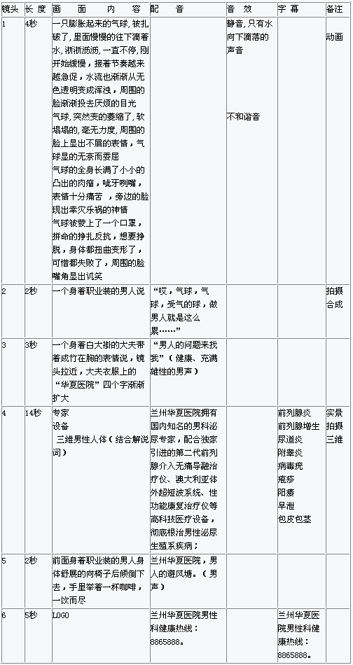 蘭州華夏醫院男性科電視廣告創意腳本之一(60秒)