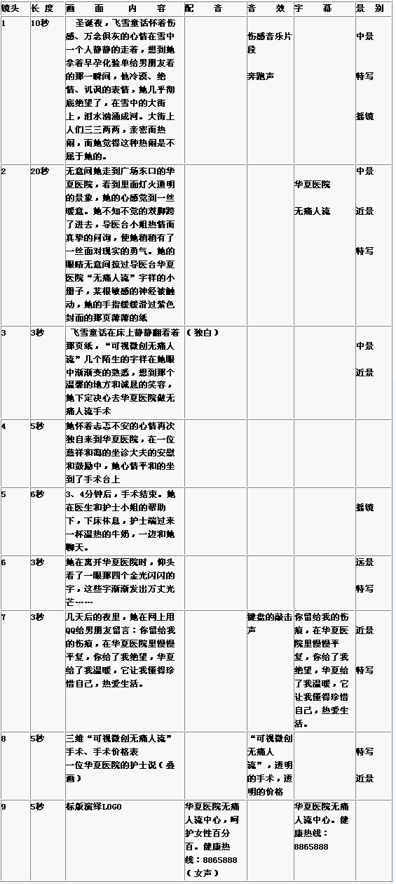 蘭州華夏醫(yī)院60秒電視廣告(無(wú)痛人流)創(chuàng)意腳本之三