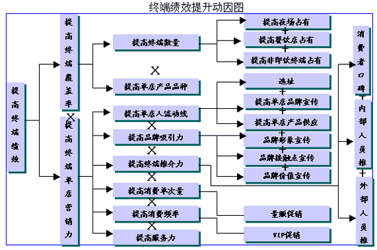 市場占有率的提升有其一定的途徑,我們從下面的終端業(yè)績提升動因圖示中可以看出,終端績效提升的途徑關(guān)鍵是終端覆蓋的提升和單店產(chǎn)出的提升。而在終端覆蓋一定的情況下,關(guān)鍵因素就是怎樣促進終端經(jīng)營者樂意接受產(chǎn)品(廠商完成鋪貨)、愿意給予最大化的陳列和熱情推介產(chǎn)品了。