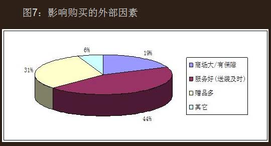 在對影響消費者購買行為的非商品因素調查時,企業信譽(商場大/有保障)、促銷力度大(贈品多等)、服務好(送裝及時等)三大核心要素,44%消費者最關注的依然是服務,在談及具體的服務需求時,主要突出在送貨、安裝是否及時;19%選擇企業信譽(商場大/有保障)度好的商場購買,也是簡接的體現大商場在服務方面要略勝一籌;此外,6%選擇其它的消費者主要強調購買的便利性,表明一部分消費者的迫切性購買。