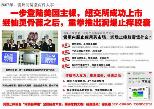 07年10月,潤燥止癢經銷商大會取得空前成功,首批共簽約拿貨3500萬,順利完成新品上市快速進入主流商業渠道的第一步,為后續高空廣告投放,各級分銷的開展,終端的鋪貨打下良好的基礎.
