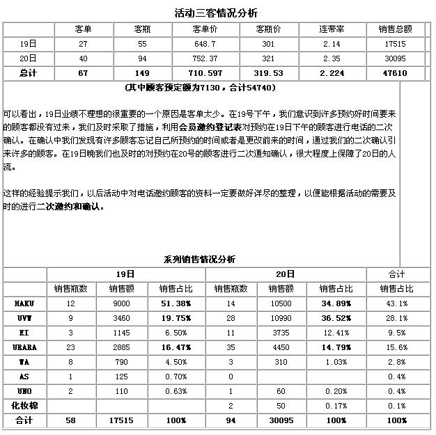 在陰雨和陽光的交替中,為期兩天的資生堂“VIP專享”活動落下了帷幕。作為該地區唯一的一家舉行“VIP專享”活動的店家,大家心情是值得高興和驕傲的。本次活動我們投入了極大的人力和物力,有兩個數據是必須要先提的,第一個數據是19、20兩天的銷售總額為47610(不含顧客預定額);第二個數據是活動企劃宣傳總費用為2970元,日本老師飲食費用合計1756元,兩項合計4726。兩個數據可看出本次活動的力度與重視.。
