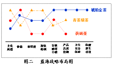 力激蕩把這些要素適當合并同類項,然后提煉出來8條最關鍵的要素;第二步是把目標客戶的另外兩個可選方案(我們選了代表全發酵茶的茯磚茶作為可選方案之一;代表不發酵茶的綠茶和代表半發酵茶的青茶作為可另一可選方案)在各個要素上的得分計算出來,就能看到目標客戶的哪些需求已經得到了很好的滿足,哪些需求尚未得到滿足;第三步就是明確琥珀•金茶的差異化定位,在哪些要素方面與現有的可選方案旗鼓相當,在哪些方面可以與眾不同,給客戶提供前所未有的體驗,體現獨到的價值,于是我們發現了兩個要素:衛生安全保障和保健養生功效(見圖二)。