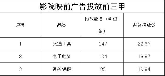 根據數據顯示,影院映前廣告投放第一的廣告品類,除了北京、上海、廣州為交通工具外,其他地區則各不相同。這也反映了不同城市映前廣告投放品類的有差別。