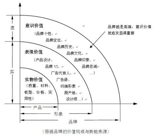 服裝品牌勢能的來源是多方面的,主要包括:高品質產品和服務、出色的品牌銷售形象、知名設計師、品牌歷史與文化、原產地效應、廣告宣傳、明星代言等等。歸結起來,可以總結為實物價值、外在形式、和意識價值三個層級。服裝品牌的價值構成要素也同時是服裝品牌勢能的構成要素: