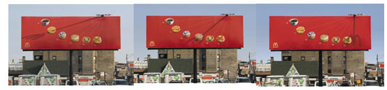 就在2006年,麥當勞的“日冕”廣告(圖3)聞名廣告界,可謂好評如潮。“日冕”廣告的聰明之處在于巧借陽光制造出移動“陰影指針”,隨著時間推移,“指針”會依次指向不同的時間點,而每個時間點上則分別是麥當勞的供餐清單。07年,李奧.貝納又一次拿太陽做文章,在同一塊廣告牌上上演了一幕精彩的“過程廣告”。