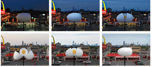 繼麥當勞“生菜”廣告牌推出并獲得不少大獎后,08年夏季,芝加哥李奧.貝納再度出手為麥當勞設計了一個驚世巨作——巨型新鮮煎蛋活動廣告牌(圖4)。整個廣告牌就是一只巨型“雞蛋”。每天凌晨六點起,“雞蛋”就開始慢慢開裂,直到完全展開露出一個新鮮煎蛋,蛋黃上寫著乳白色廣告語:“Fresh Eggs Daily”(每日鮮蛋),一直到十點半早餐時間結束,一直保持敞開狀態,提醒人們該時段有新鮮煎蛋供應,而后又封閉起來,直到第二天早上六點重新裂開。正如業界人士驚嘆的:“這樣創意絕佳的廣告牌勝過千言萬語”,不但能有效吸引注意,而且有著極佳的提示作用,誘使人們禁不住走進店里去品嘗一番。