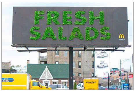 這是一個令人印象深刻的“行為藝術”,廣告人竟在垂直的廣告牌上種起了生菜!看著生菜種子在土紅色的土壤中發芽、出苗最后生長成翠綠茂盛的青菜,著實讓人大開眼界,又一次見識了來自廣告人的睿智和餐飲巨人的膽略。整個生長過程歷時三周,而整個實工團隊則包括了園藝師、裝置安裝師和園丁,所用的生菜菜籽則包括了麥當勞出售的所有生菜品種。