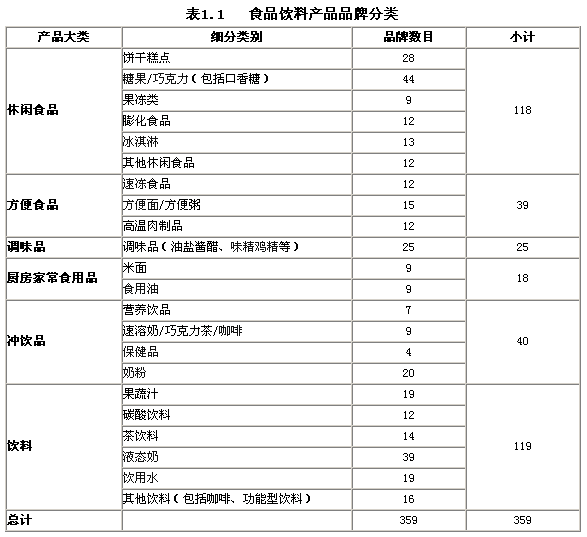 本研究根據(jù)產(chǎn)品屬性將以上品牌分成了六大類(lèi),分別是休閑食品、方便食品、沖飲品、調(diào)味品、飲料、廚房家常食用品。具體分類(lèi)情況見(jiàn)表1.1。