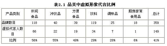 虛擬形象代言人在大量的公司及品牌中都有涉及,通過(guò)研究發(fā)現(xiàn),所有搜集的研究對(duì)象中,有149個(gè)品牌在宣傳中運(yùn)用了虛擬形象代言人(授權(quán)卡通形象除外),其比例約為41%。其中休閑食品、沖飲品和方便食品的比例最高,分別為56%、55%和49%。