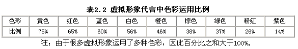在虛擬形象代言中,一般需要黑色來(lái)點(diǎn)綴或勾勒形象,因此,黑色的運(yùn)用比例中份額較大。黃、紅、藍(lán)色在虛擬形象中的運(yùn)用最多,比例分別是75%、65%和60%。(如表2.2)紅黃藍(lán)這三種顏色正好是顏料三原色,是色彩運(yùn)用中最基礎(chǔ)最單純的三種顏色,大量運(yùn)用到虛擬形象中來(lái)能更好地展現(xiàn)出色彩的美感。