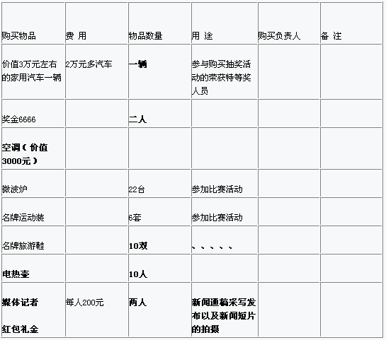 每次的商業文化商家都會做出合理的預算,這次我們也會做出合理的預算。我們本著少花錢多辦事。以下我們作出本次活動預算供領導參考!