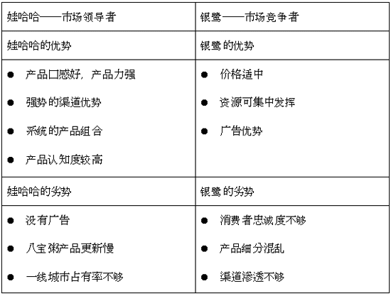 娃哈哈非常可樂依靠強大渠道優勢,利用兩樂在三線及其以下市場的缺失成就了中國碳酸飲料市場三國割據的局面;雨潤依靠雙匯、金鑼的現代渠道的缺失,先有一線城市的商超市場入手成為了火腿腸行業的一支新軍;農夫山泉利用其產品差異化和強大的品牌傳播力在瓶裝水市場后來居上,占領了當時瓶裝水市場的至高點。在八寶粥市場銀鷺應該進行怎么樣的品牌升級才能成為新的市場領導者。娃哈哈是八寶粥市場的市場領導者,銀鷺要在這個市場有所作為就只能在自己現有的優勢之上利用娃哈哈在品牌營銷上的不足來超越并成為這個行業的市場領導者。下面是現階段銀鷺和娃哈哈的市場優勢與市場劣勢。