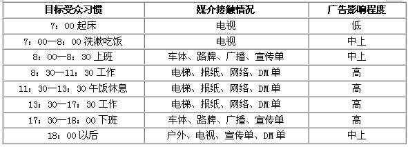 據央視索福瑞調查顯示目標受眾媒體接觸習慣及廣告影響程度如下: