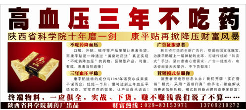 產品的“金身”已經打造好,就等著下海啟航了。這時候的宣傳推廣策劃至關重要,宣傳推廣策劃的第一步是確定宣傳推廣的主題。又是一個頭腦風暴會議,大家各抒己見,眾說紛紜。宣傳推廣是直接面對患者的,宣傳主題一定要是他們需求最迫切的,這就要求我們找準產品與患者之間最切合的交點。逆向思維讓我們回到患者角度,他們飽受高血壓的折磨,又屢屢對降壓產品失望。他們迫切需要的是一個健康的結果,而不是方案。方案永遠是一個美麗的故事,對于急功近利的消費者,結果才是最有吸引力的。正如營銷界一個經典論述“消費者需要的不是一個鑿子,而是一個孔”一樣。我們的能給患者的“孔”在哪里?電光火石一般,我們想到了“三年不復發”,這不正是康平貼能給患者的“孔”么?這正是產品與患者之間完美的交點!但是轉念一想,還覺得這個主題有點單薄,有所欠缺。大家一合計,國內消費者還極其關注的是“價格”。其他降壓貼劑都是低價低質形象,為了維持、豐滿康平貼的高質形象,必須走“高性價比”策略,即購買一個月康平貼的費用為888元,可保高血壓3年不復發,計算下來每天花銷才不到6毛錢,這就是“高性價比”戰略。宣傳上,888元可以吸引更多的眼球和聯想。根據消費者關注的兩大方面結合起來,我們的豐滿且充滿誘惑力的宣傳主題出爐了:“康平貼六百六十八,高血壓三年不復發!