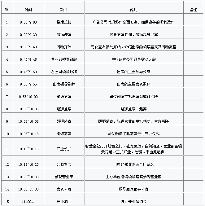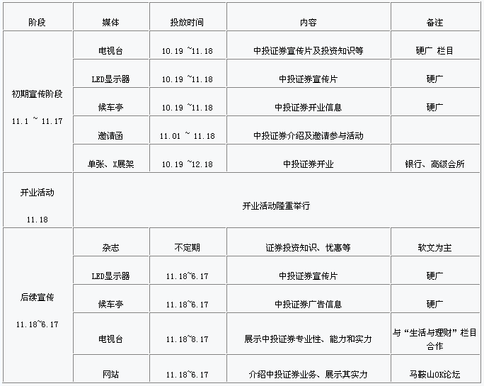 本方案圍線:“把中投證券宣傳推廣出去,讓馬鞍山市民,特別是潛在客戶了解、選擇中投證券”這一目標,以開業慶典為核心,通過媒體整合的宣傳,拉近市民、客戶與中投證券的關系,推動中投證券馬鞍山營業部迅速打開市場局面。