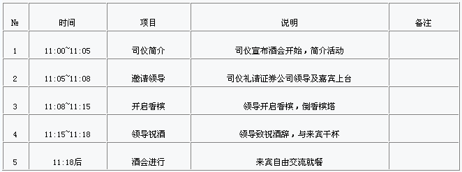 承接活動主題,有關活動將為營業部建立“睿智、高雅”的形象。因此在活動后期安排西式餐酒會,答謝撥冗光臨指導的領導嘉賓及各屆朋友。酒會以紅酒及香檳為主,餐點采用馬鞍山特色美食為主,配合精美的西式小點,宴會開始前安排領導進行簡單而隆重的開香檳儀式,有力地突出了營業部高雅的文化品位。